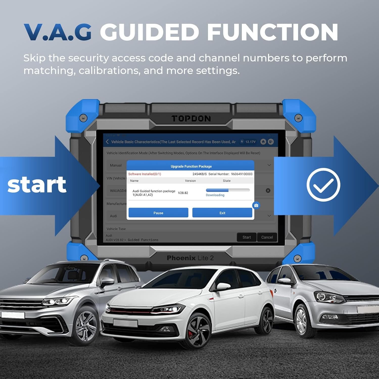Función guiada por V.A.G: La herramienta de diagnóstico de automóviles Phoenix Lite 2 tiene acceso a la función guiada V.A.G con procedimientos paso a paso, que agilizan el proceso de reparación y promueve un diagnóstico de automóvil rápido y preciso. Siga las indicaciones para un funcionamiento fácil y conveniente, adecuado para vehículos VW, SKODA y SEAT