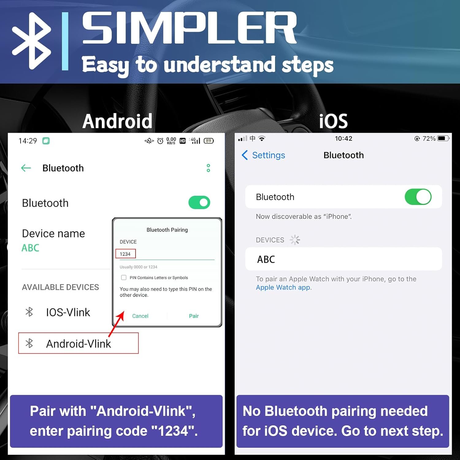 Funcionamiento sencillo: compatible con dispositivos Android e iOS no se necesita emparejamiento Bluetooth en iOS; simplemente conéctalo en la aplicación. Los escáneres iCar Pro 2S Bluetooth OBD2 tienen una configuración más simple, menor consumo de energía, en comparación con los adaptadores WiFi, y no bloquean el acceso a Internet para otras aplicaciones.