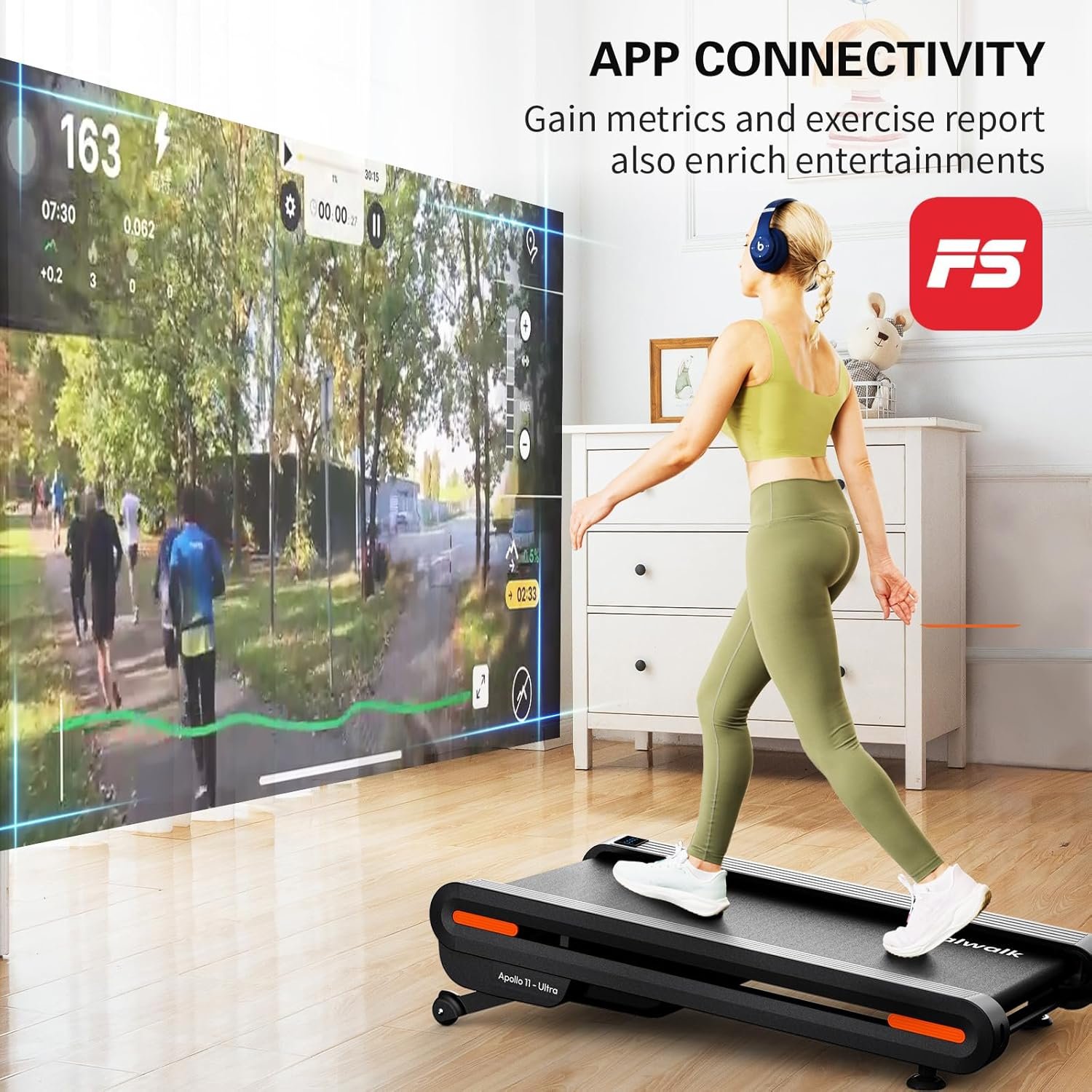 【Inclinación automática inteligente + ecosistema de aplicaciones】La inclinación automática de 6 niveles 12% la más alta de su clase simula colinas o montañas a través del control de aplicaciones, ideal para HIIT, pérdida de peso o entrenamientos cardiovasculares. La almohadilla para caminar con inclinación se sincroniza con Apple Health/Strava para rastrear calorías, distancia y cursos virtuales: conectividad remota para programación HIIT debajo del escritorio.