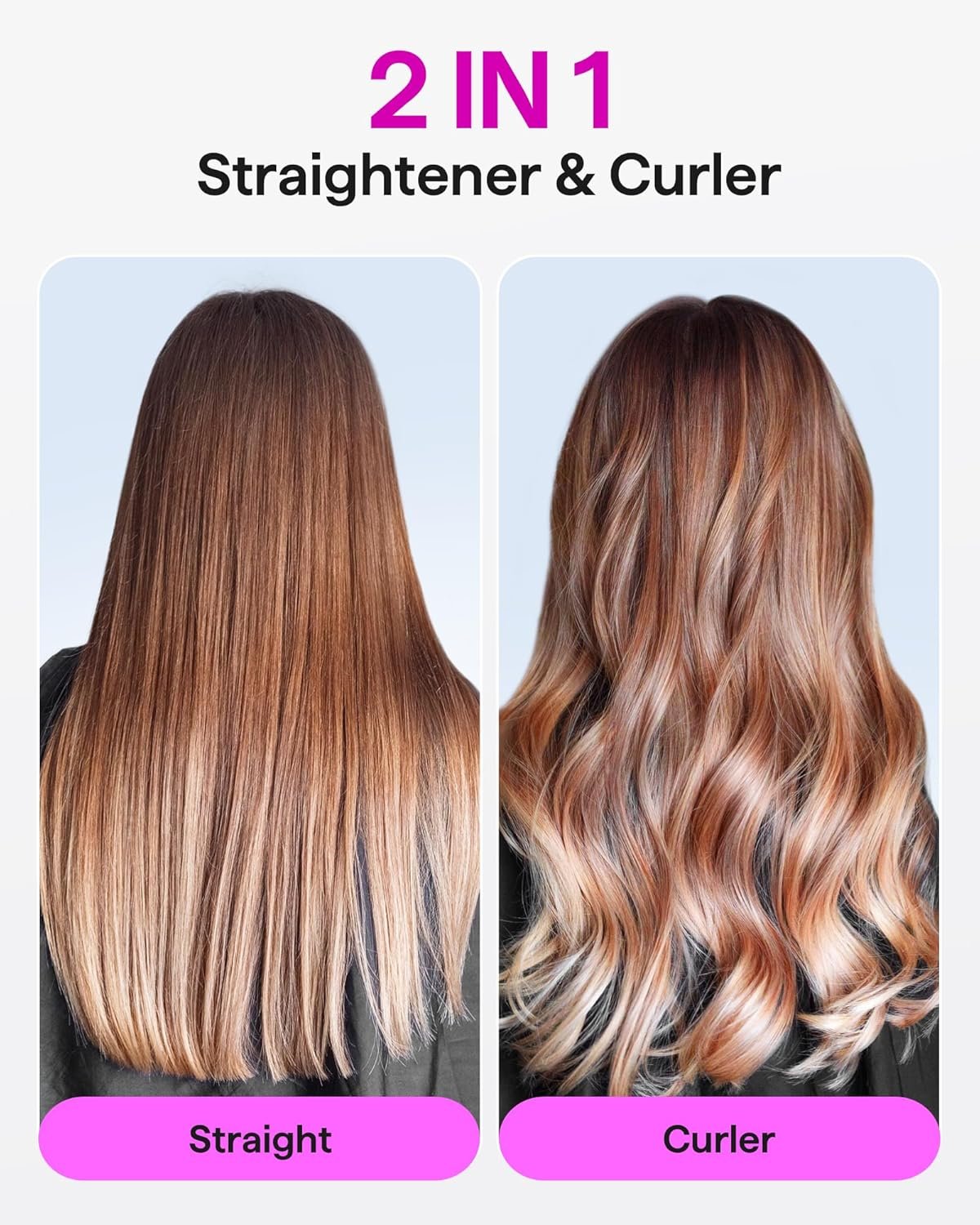Herramienta de peinado 2 en 1: diseñada para manejar todas sus necesidades de peinado, esta plancha alisa, ondula, y riza sin esfuerzo, atendiendo a una variedad de tipos de cabello. Desliza el moldeador a través de tu cabello para lograr un aspecto elegante y recto, ondas suaves o rizos definidos. Su diseño único de borde ofrece una versatilidad excepcional, lo que te permite crear una gama de estilos, desde pulidos y suaves hasta bellamente texturizados