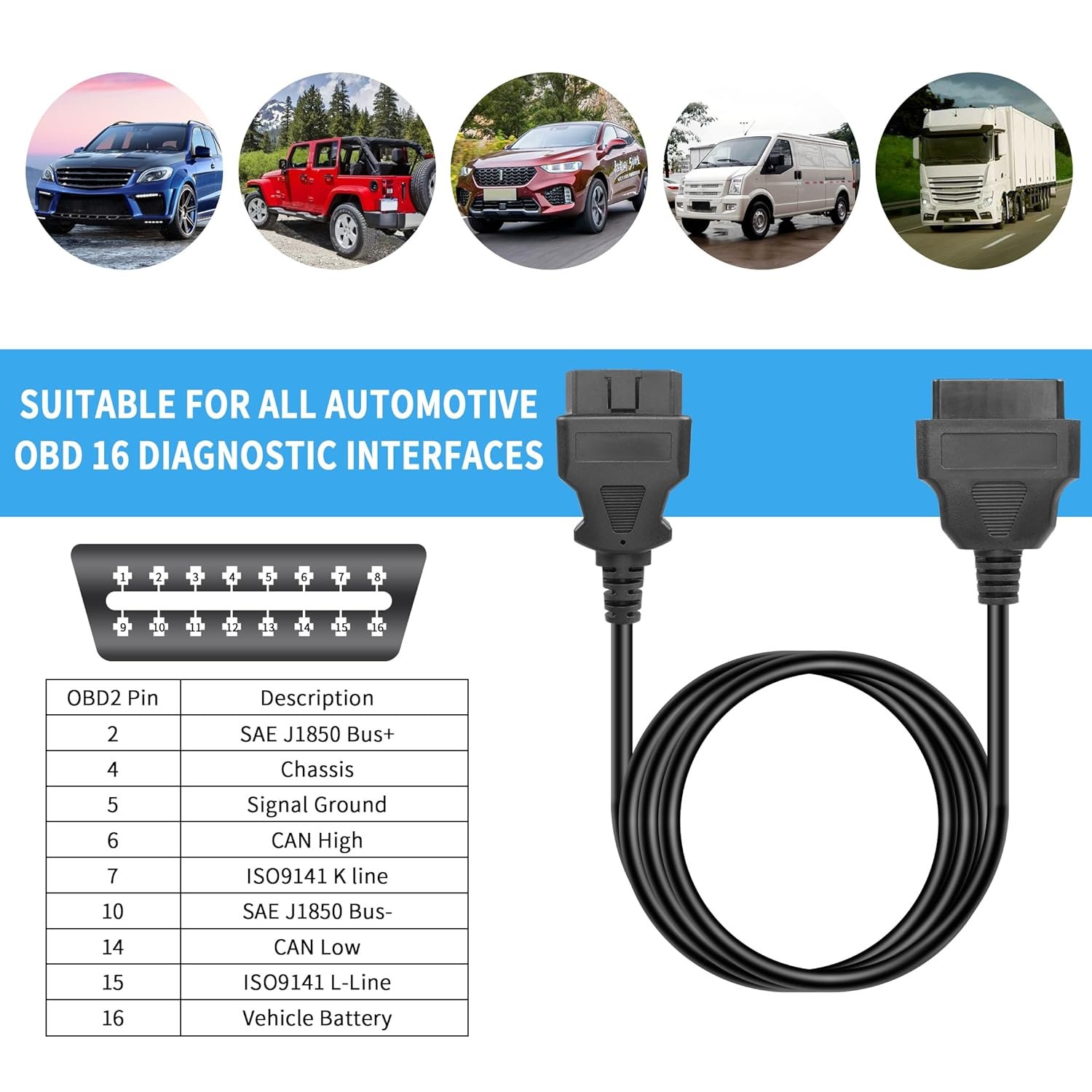 [Cable de extensión OBD2 de 16 pines] El cable de extensión OBD2 conector J1962 está diseñado con una interfaz de diagnóstico universal de 16 pines y es compatible con todos los protocolos OBD2 de 16 pines estándar, escáneres y herramientas de diagnóstico, incluyendo CAN.