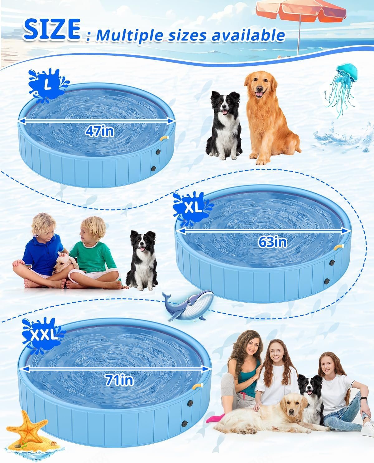 - Múltiples opciones de tamaño: nuestras piscinas de juegos de agua vienen en una variedad de opciones de tamaño, mide el tamaño de tu perro antes de elegir para elegir la piscina adecuada. No dudes en ponerte en contacto con nosotros si tienes alguna pregunta.