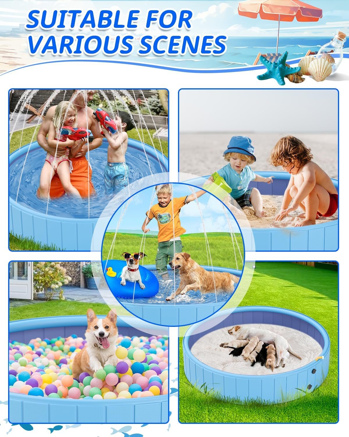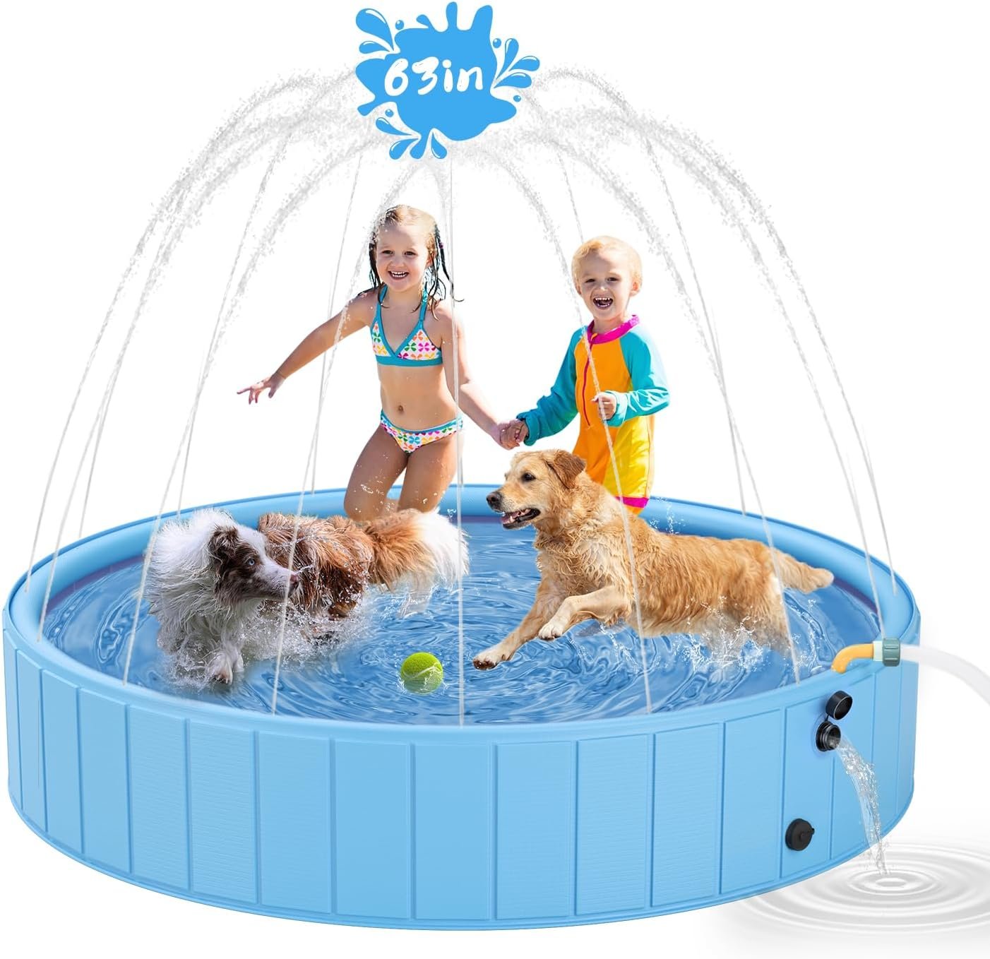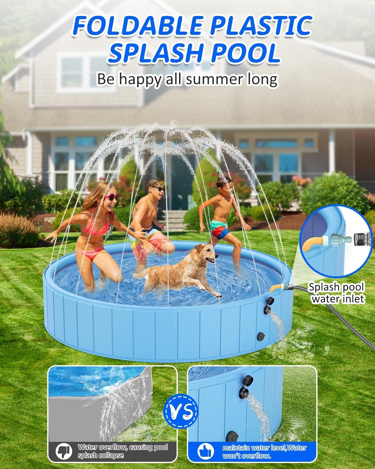 - Diseño humanizado: la piscina para perros cuenta con una entrada de agua estilo codo que proporciona una presión de agua estable, lo que hace que el proceso de pulverización sea controlable y agradable sin salpicaduras desordenadas. Además, la piscina para niños está diseñada de forma inteligente con una boquilla de agua alta para evitar cualquier desbordamiento mientras mantiene un efecto de pulverización constante. El diseño humanizado añade más diversión y fortalece el efecto de uso.