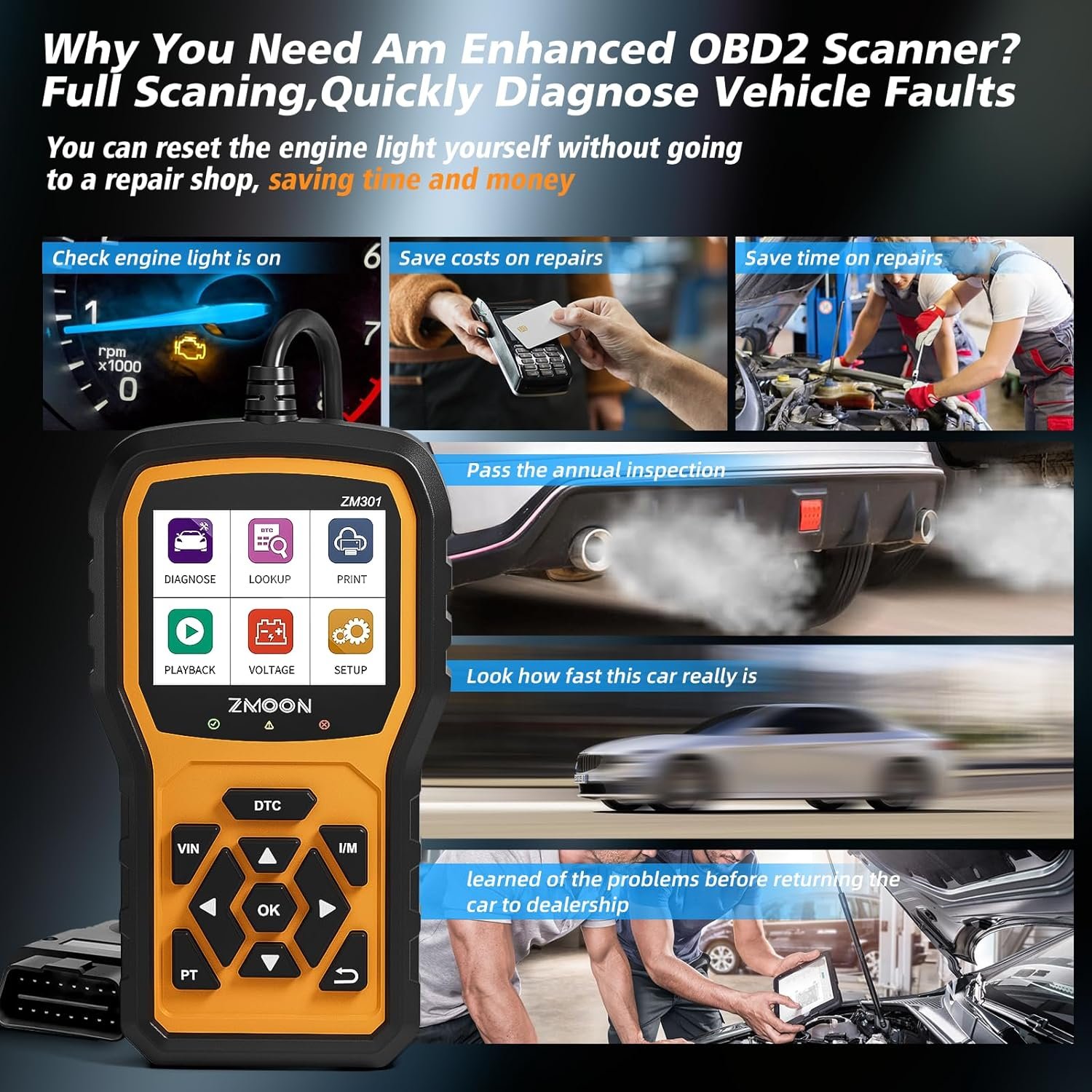 ZMOON Herramienta de diagnóstico del escáner ZM301 OBD2, herramienta de la exploración del diagnóstico del lector de código del coche OBDII/EOBD para todos los coches después de 1996