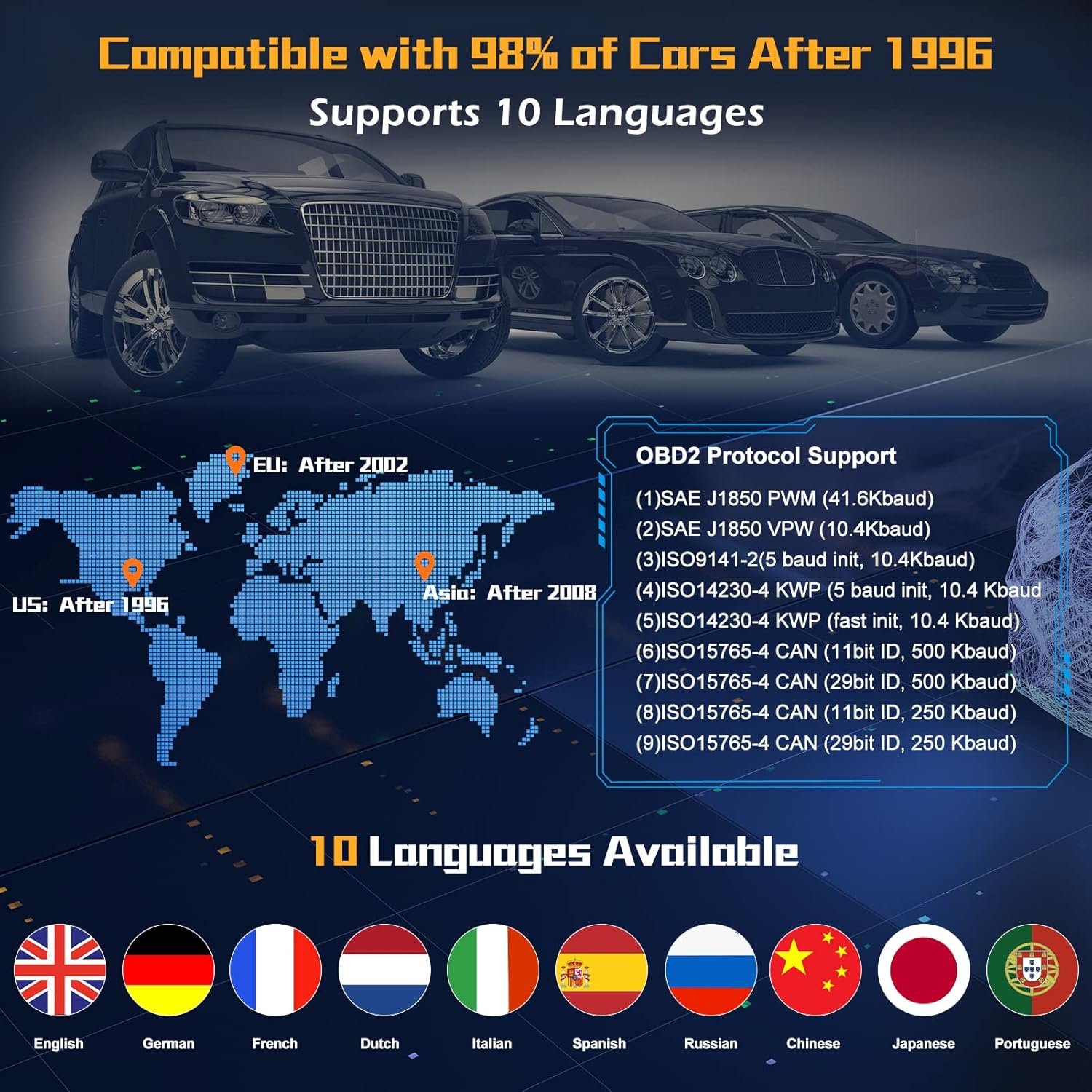 Compatible con el 98% de vehículos: el escáner ZM201 OBD2 para automóvil es compatible con la mayoría de los automóviles después de 1996 EE. UU./2002 EU/2008 Asia. Si su automóvil tiene un puerto OBD2 16Pin, y el tiempo de producción cumple con la línea de tiempo anterior, entonces su vehículo es compatible. Pero no es compatible con vehículos de nueva energía, vehículos híbridos y modelos que no cumplen con el protocolo OBD2.